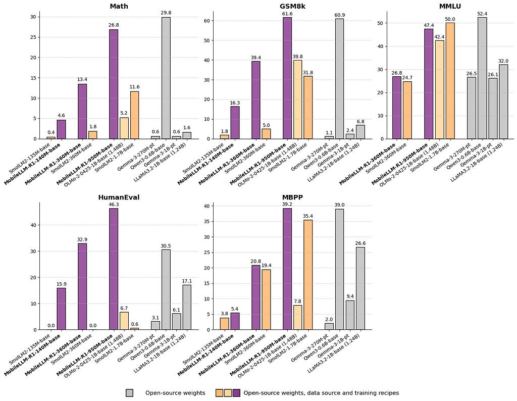 - Base models: MobileLLM-R1–140M-base, 360M-base, 950M-base