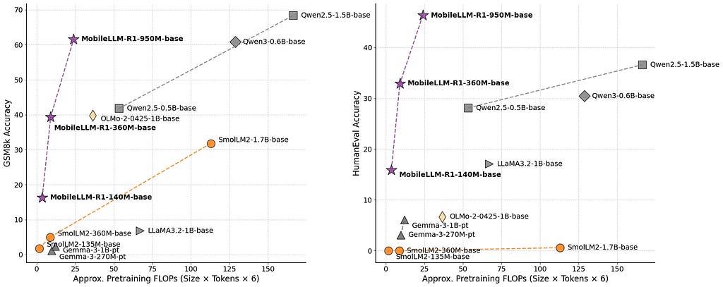 - Final models: MobileLLM-R1–140M, 360M, 950M